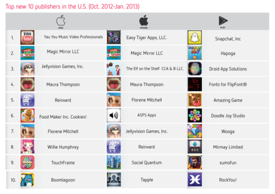 上图中列出的就是在App Store和Google Play中最受欢迎的十款由新加入的开发者开发的应用程序。排名中大部分应用都属于游戏,只有少数例如非游戏类应用勉强上班。当然在Google Play中排名第一的Snapchat属于一个特例。