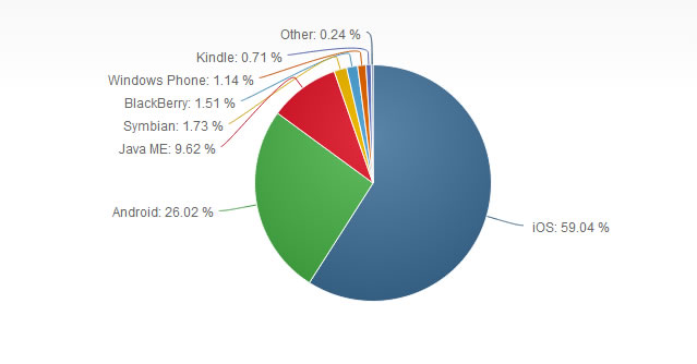 NetApplications最新4月份移动系统占有率数据显示,尽管微软在Windows Phone的推广上下了不少力气,但收效很小,4月份相比三月份甚至还下降了0.36%,最新数据为1.14%,而一直被认为已经被淘汰的黑莓依然有1.51%。苹果的iOS是最受欢迎的移动系统,最新的数据为59.04%,Android则为26.02%,以下是统计图表: